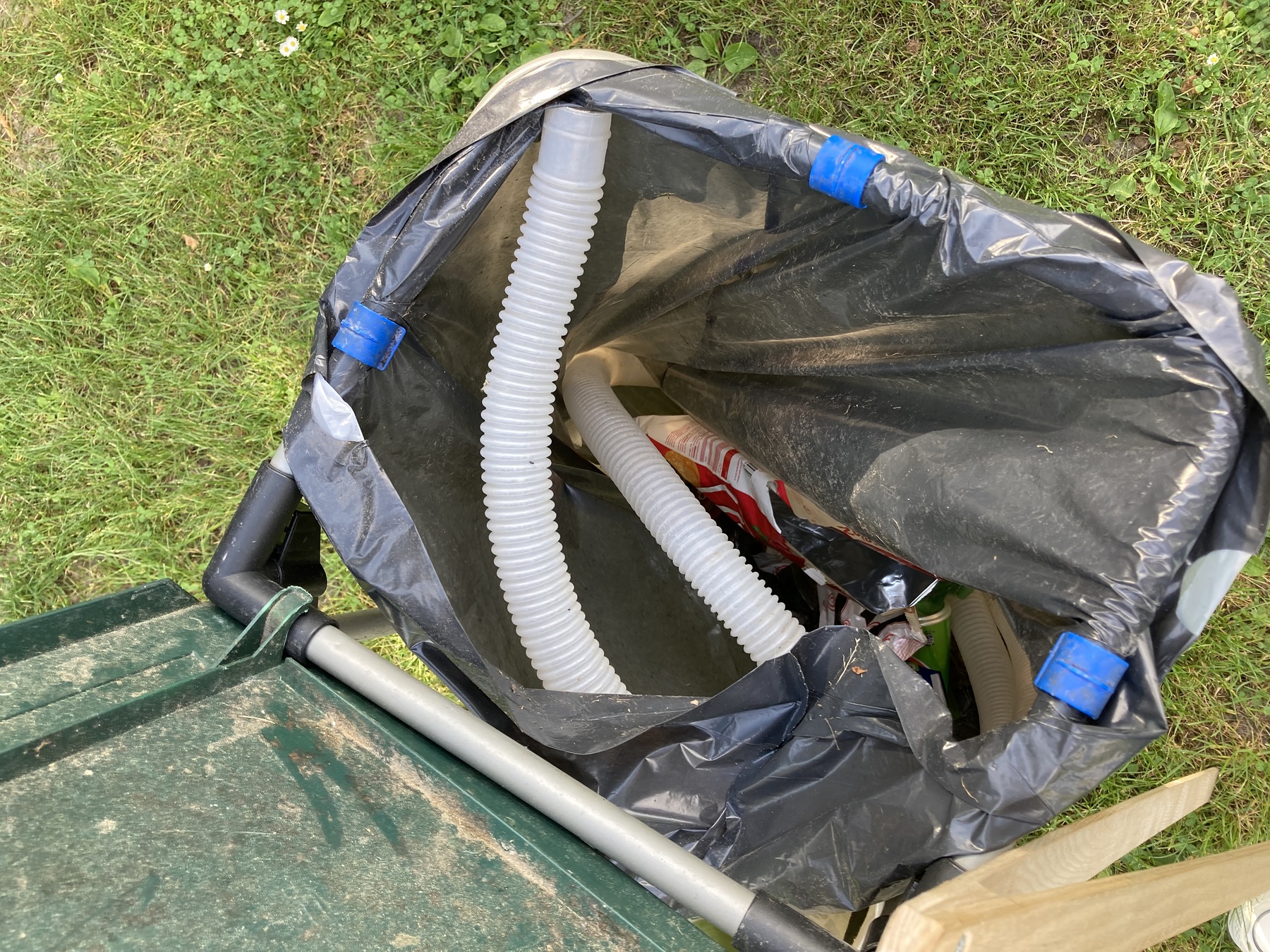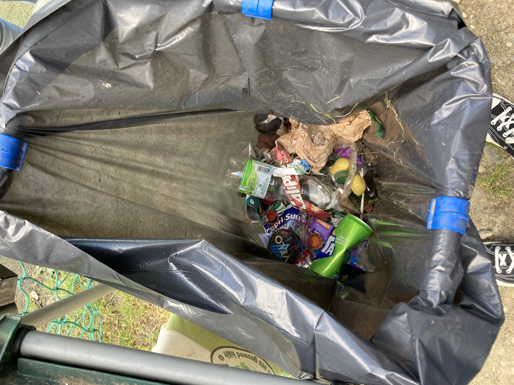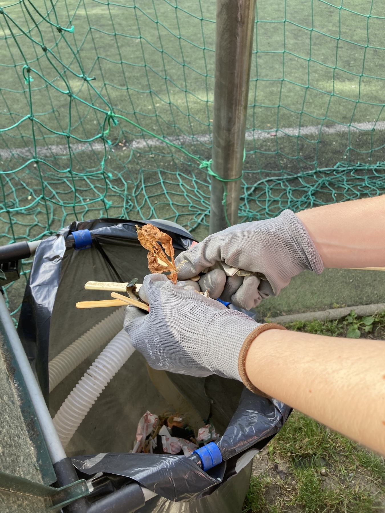 Mit einem vom Fjutscha ausgeborgten Müllwagen und Müllzangen und Handschuhen gingen wir also am Mittwoch, 1. Juni bei relativ schönem Wetter in den Park. Im Park und auf dem Weg dorthin trafen wir schon ein paar Kids, die wir vom Sommer kennen und die fleißig mithalfen. So teilten wir Handschuhe aus und uns in Kleingruppen auf, wo wir uns am Fußballplatz und im Park verteilten und jeden noch so kleinen Müll aufsammelten. Dabei kam es auch zu interessanten Gesprächen rund um das Mülltrennen und Wegschmeißen, wobei das Bewusstsein der Kids dafür sicherlich geschult wurde. Nachdem der Müllsack schon sehr voll war und wir sicher 1,5 Stunden unterwegs waren, trafen wir uns zu einem köstlichen Picknick zusammen: Es gab Pizzaschnecken von Feli und eine aufgeschnittene Wassermelone.