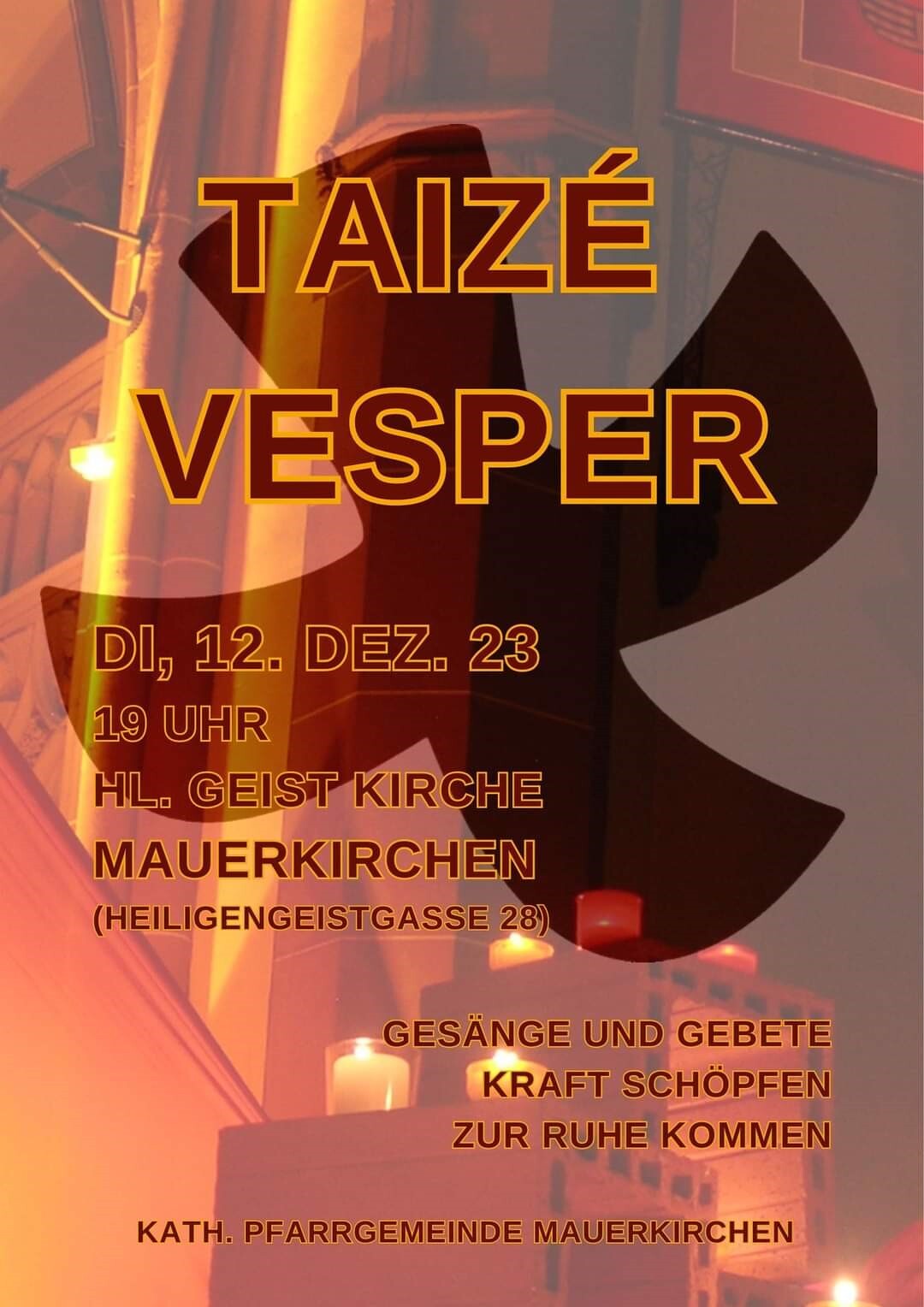 Taize - Vesper in der Hl. Geistkirche in Mauerkirchen am Dienstag , 12. Dezember 2023 um 19 Uhr. Bitte Kerze mit Tropfschutz mitnehmen (Teelicht), auch Liederbuch wenn vorhanden.