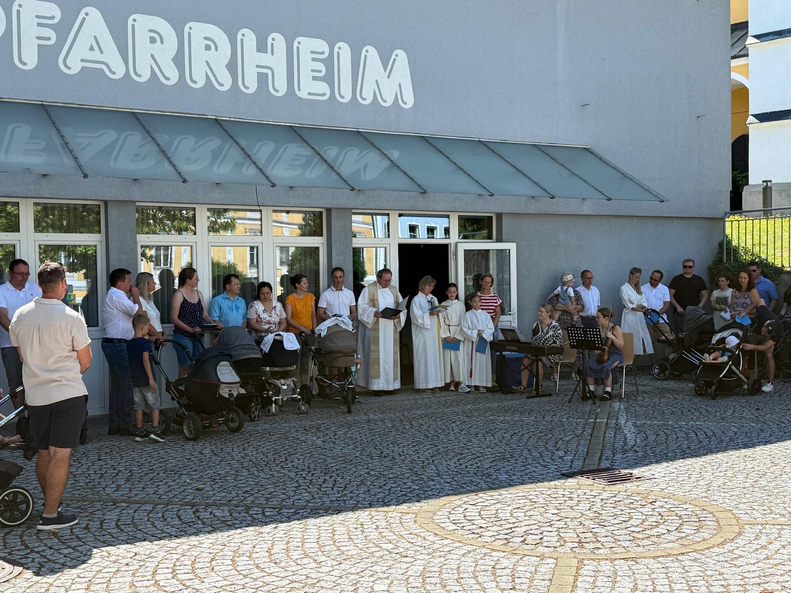 Das Fachteam Kinderliturgie gestaltete die Feier mit Texten und Liedern. Nach einem gemütlichen Rundgang mit den Kinderwägen segneten Pfarradm. Hans Wimmer und PAss.in Paula Wintereder im Pfarrsaal feierlich alle Kinder und ihre Familien.